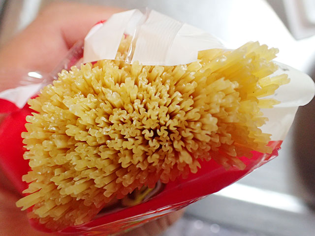 このスパゲティーは、普通のものの半分の長さなのでソロキャンプに最適。